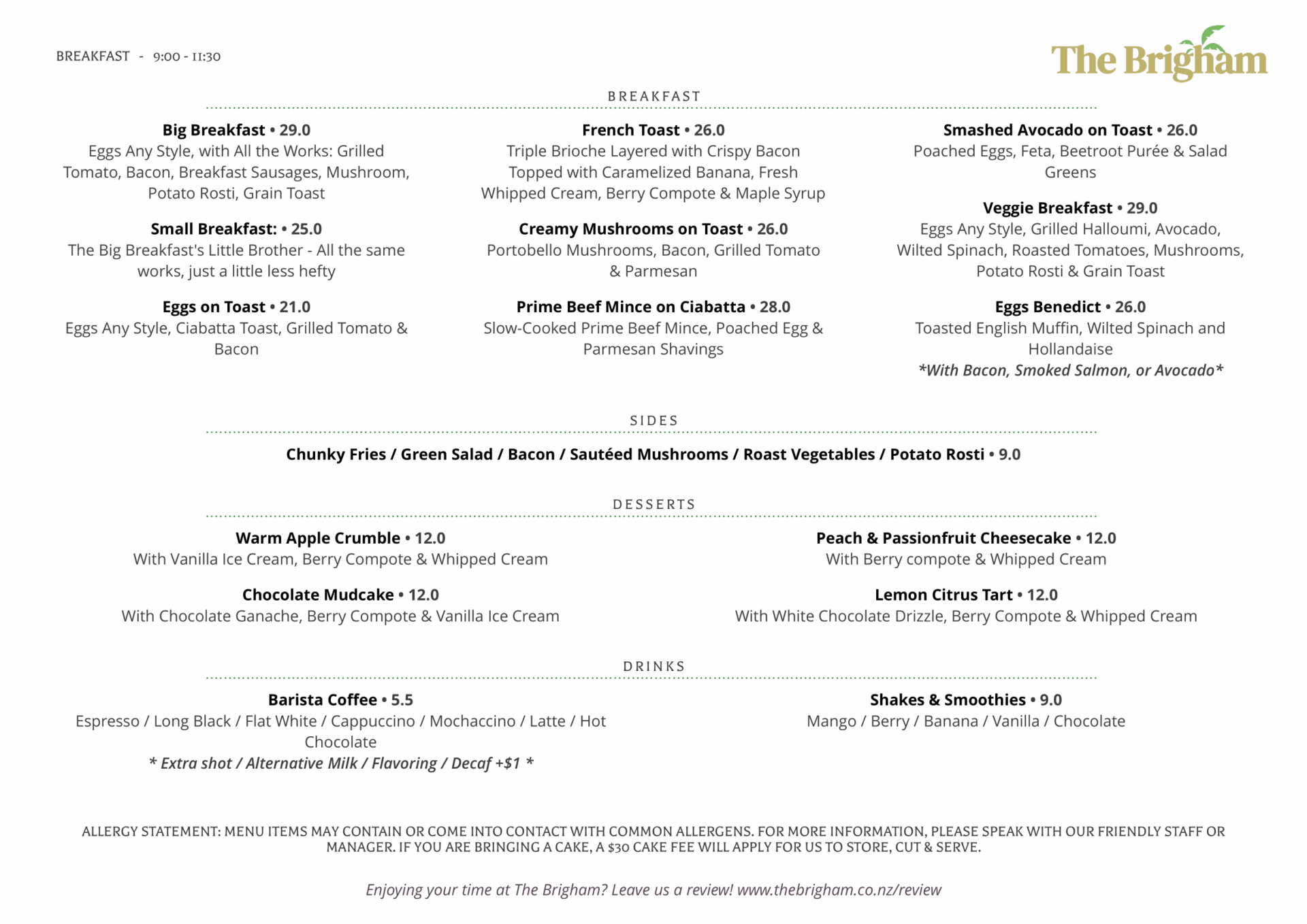Open five days a week, Wednesday to Sunday, The Brigham Café offers a wide range of delicious and varied menu options to cater for all guests and occasions.